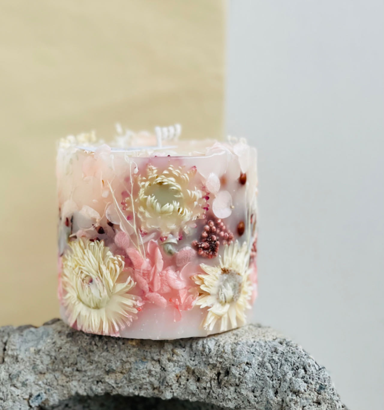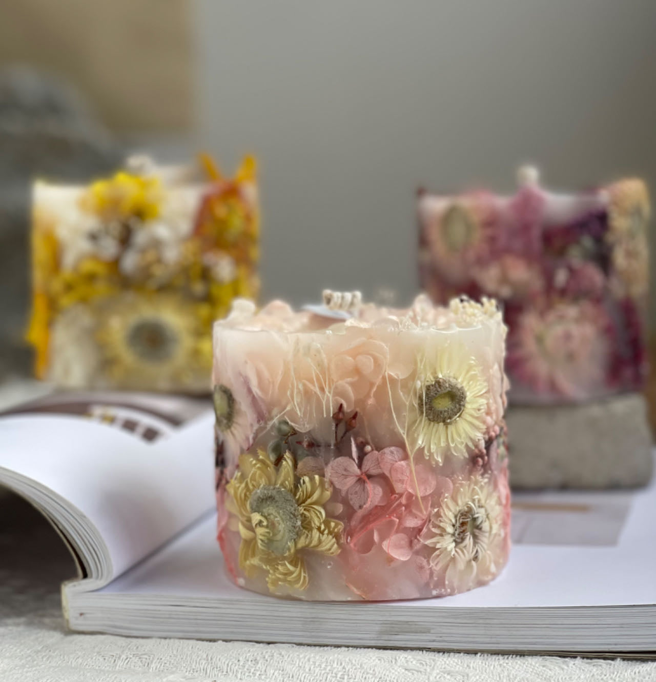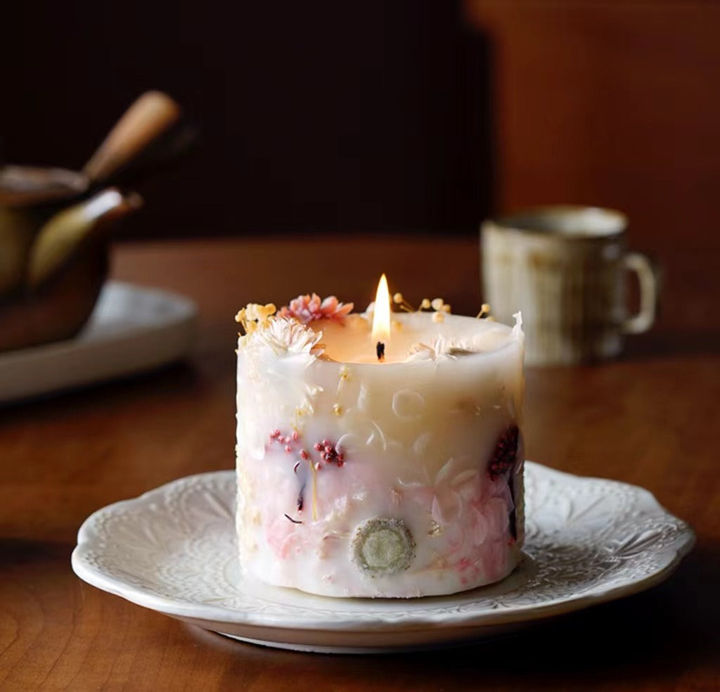 Design Story:This series of products is inspired by Impressionist paintings. Its rich colors and romantic expressions add a lot of beauty to our ordinary life. The outer shell of the product is made of different proportions of wax. The outer shell will remain after burning, and the light will shine through, making it romantic and warm. it's all handmade from wax and artificial flowers.