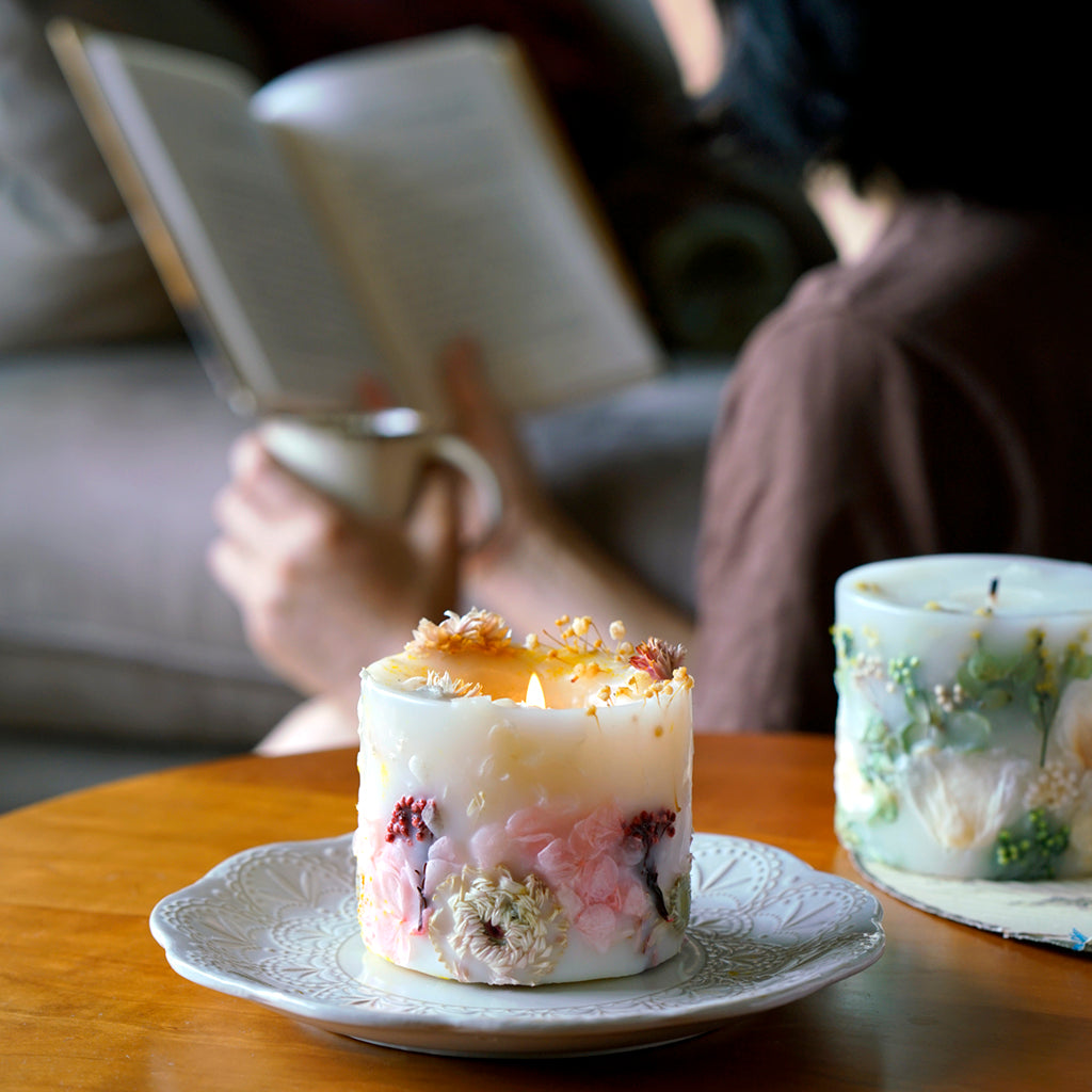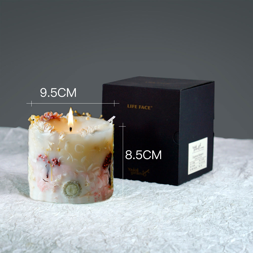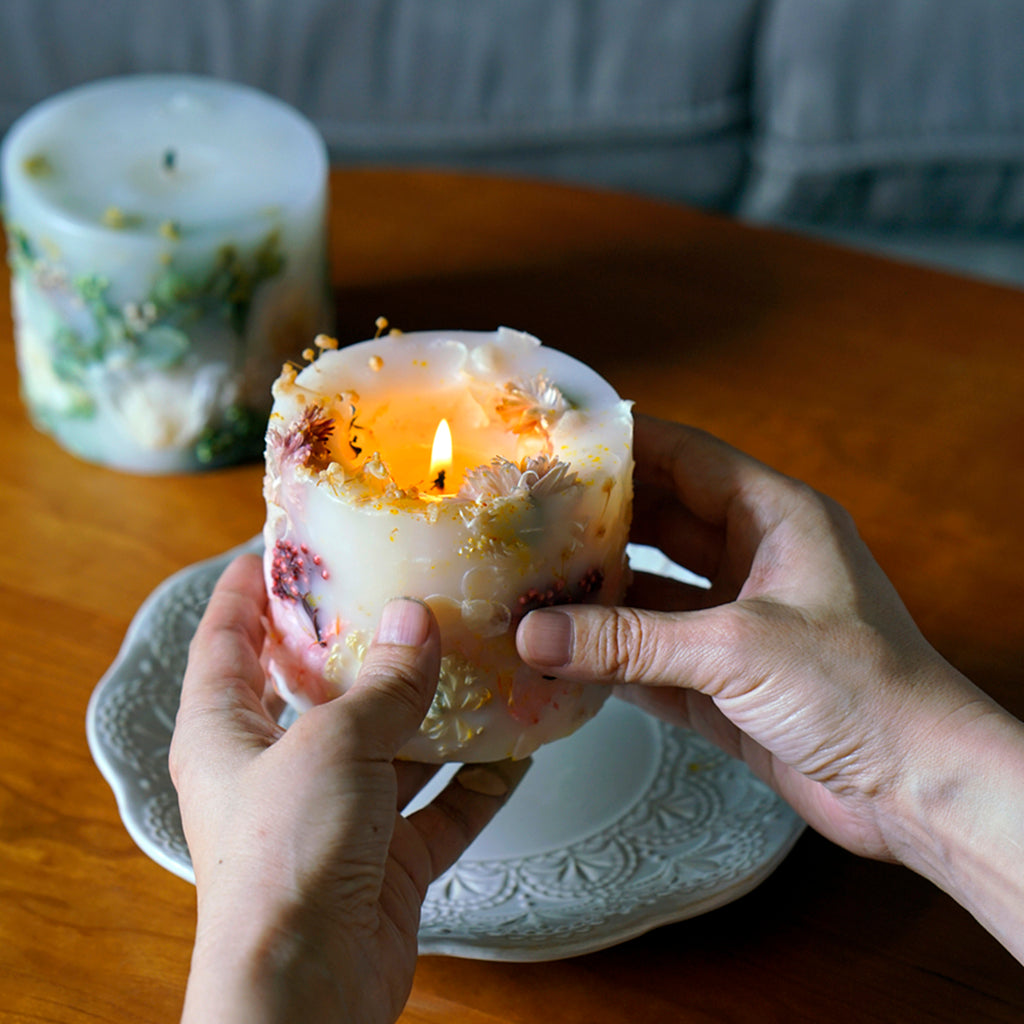 If there are decorations on candle’s surface, such as dried flowers, please remove them then light the candle to avoid the decorations from catching fire, causing unnecessary accidents. If there is no container for the candle, please put the candle on the Flame retardant tray before use and stop using the candle when it burned to the last 2 centimeters. Please keep the candle in a place out of the reach of children/pets while away from flammable materials, such as curtains, and make sure the candle is Kept within eyesight and used in a ventilated environment.